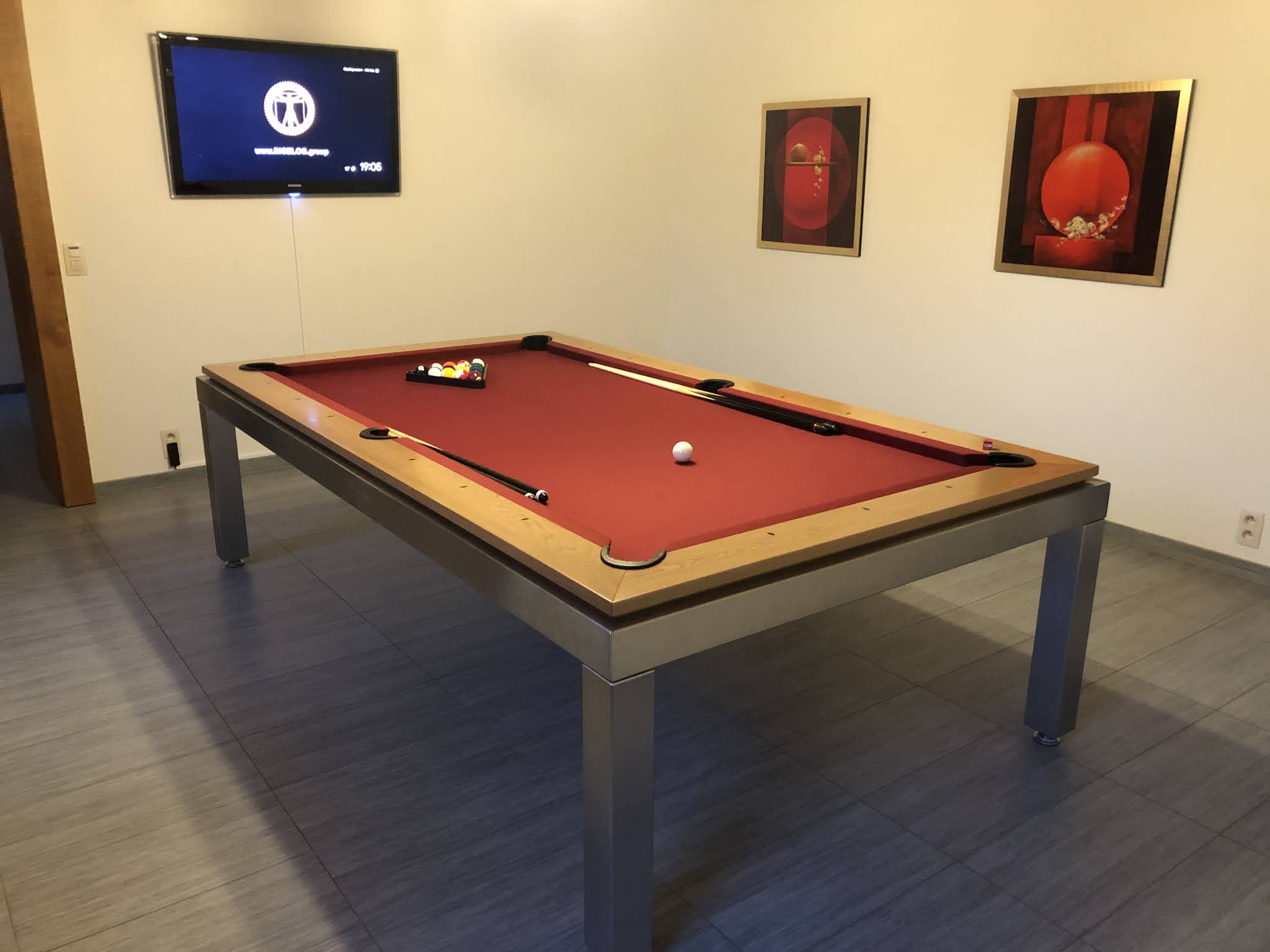 Très belle réalisation : Table convertible billard Pool anglais (modèle Néo) avec plateau en verre et structure en bois massif hêtre naturel. Délai de livraison respecté malgré les contraintes de la crise sanitaire actuelle. Installation réalisée par un artisan billardier : travail de qualité, parfait ! Merci pour votre performance et professionnalisme. C'est dorénavant un plaisir de pouvoir jouer au billard chez soi.